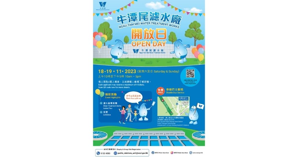 牛潭尾濾水廠將於11月18日至19日舉行一連兩天的免費開放日,參觀的市民可了解食水的處理過程,即日起可透過登記系統報名,先到先得,截止報名日期為10月26日下午6時,每人最多索取4張入場券,成功獲入場券者將於11月4日或之前經電郵收到電子入場券。當局會當日安排免費穿梳巴士往來錦上路港鐵站及濾水廠,接載參觀者。活動詳情可參閲水務署網站。