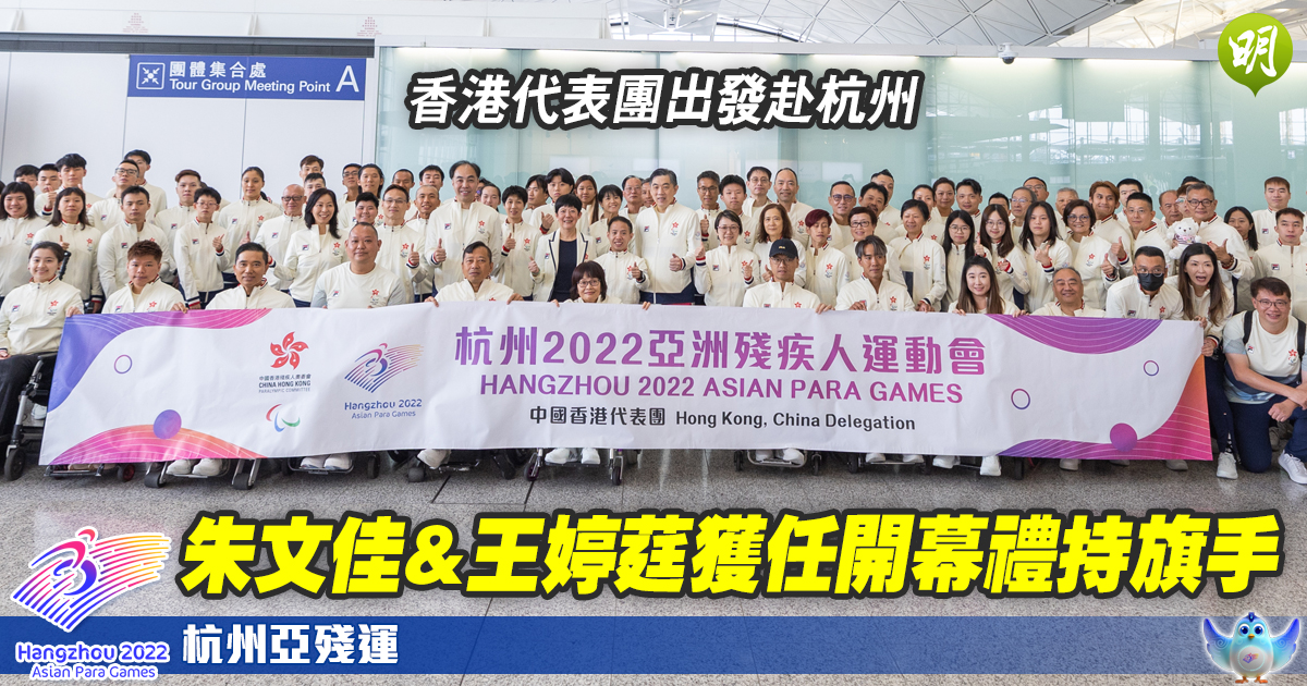 今屆杭州亞殘運於10月22至28日舉行,港隊派出98名運動員參戰11個項目。港隊大部分運動員今隨團一起啟程備戰,而團長陸子聰在出發前宣布,將由朱文佳及王婷莛為港隊擔任開幕禮持旗手。身為上屆亞殘運羽毛球SS6級男單金牌得主的朱文佳表示:「我將在今屆亞殘運首次兼三項賽事,望能為港增光,感謝中國香港殘疾人奧委會給予我機會擔任持旗手,為今次出戰杭州增添多一重意義。」而乒乓女將王婷莛亦榮幸能擔任持旗手,「這身分也為我在比賽中添加多一分力量」。