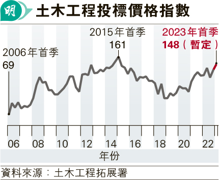 【明報專訊】近年政府工程開支趨增,據土拓署制訂的「土木工程投標價格指數」,今年首季暫定指數為148,是2015年首季以來最高。該指數以2010年第一季為基準、指數為100,之後每季編訂一次,供政府各工務部門參考,估算工程成本。