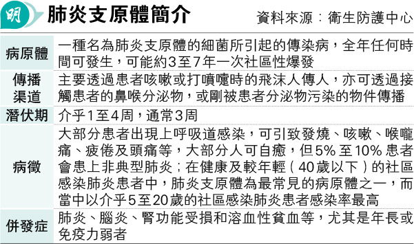 另外,衛生防護中心稱留意到內地肺炎支原體感染情况,按最新監測數據顯示,今年8月起因肺炎支原體感染而入住公院人數增加,惟未至2016及2019年高峰水平。肺炎支原體是一種常見病原體,雖現今未有疫苗針對其感染,但合適的抗生素可有效治癒病人,戴口罩能有效預防包括肺炎支原體感染的呼吸道傳染病。