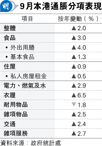 【明報專訊】政府統計處公布,本港9月消費物價指數(CPI)按年上升2%,略高於市場預期的1.8%,亦較8月增速加快0.2個百分點,撇除所有政府一次過紓困措施的基本通脹率為1.8%。政府發言人表示,9月通脹升幅擴大主要受颱風和極端天氣帶動蔬菜價格等食品價格上升所致,基本通脹率維持溫和。