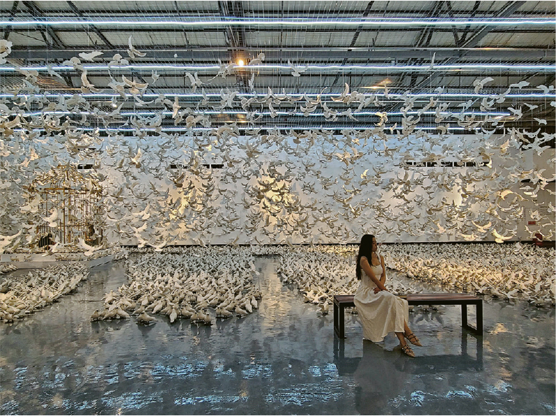 成千上萬的鴿子在你我的身邊群飛,聽起來有點不可思議,不過走入華僑城內的最新展覽,就可以體驗如此震撼場面,兼可以擺甫士影靚相呃like。這群鴿子其實是以一萬隻仿真鴿佈局而成的藝術品,名為《和平廣場》,是現正舉行的「新童話主義:周藝文個展」中最核心的作品。由內地知名藝術家和童話作家、有「童話爸爸」之稱的周藝文操刀。今次展覽是繼上海站後「周藝文當代藝術全球巡展」的第三站,透過場中的40多幅畫作及6個大型裝置藝術作品,傳達他對愛、和平與環保的思考。
