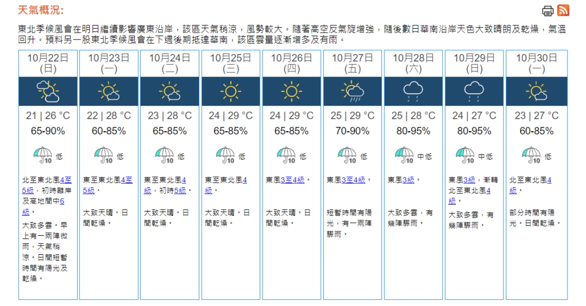 天氣|天文台:周日有微雨市區最低21°C 重陽節料天晴乾燥 (18:05)