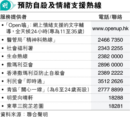 【明報專訊】8間資助大學的學生事務代表昨日發表聯合聲明,稱最近發生數宗大學生及年輕人不幸離世事件,深表哀痛。他們呼籲大學生重視個人心理健康,並明白自我傷害不能解決問題;另鼓勵學生尋求幫助,向信任的人傾訴表達個人感受,以及在校內以至校外與友輩互相關懷和支持,「我們共同努力確保每位學生在其大學生涯,都感受到校方的關懷和支持,及聆聽他們的聲音」。