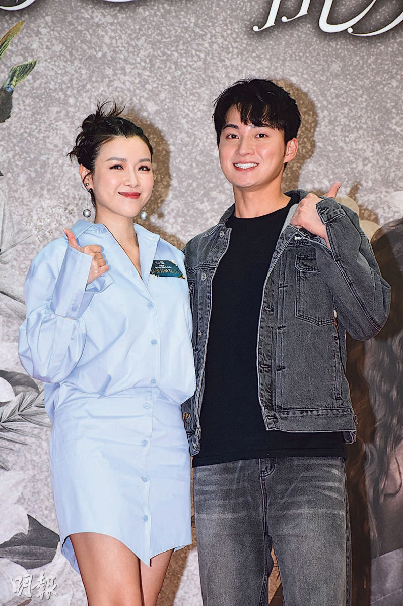 【明報專訊】陳茵媺、周嘉洛、徐文浩、鄺潔楹和羅毓儀等昨日宣傳無綫台慶劇《羅密歐與祝英台》。司儀在遊戲環節要求一眾演員示範當知道另一半拍劇,要拍親密戲時的反應,陳茵媺即用手掩眼,搞笑示意無眼睇。黎學勤則出絕招,當眾跪地向前輩馬海倫示愛搶鏡,又與周嘉洛齊向馬海倫獻吻,場面溫馨又搞笑。
