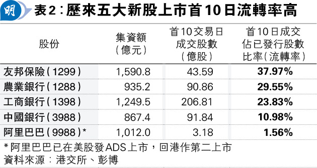 「新股掛牌上市,對帶動港股交投量有很大幫助,原因是新股上市首數日,交投量會較其他股市高出很多倍,從而推升整體市場的流轉率(velocity)。」港交所(0388)前主席李業廣在2006年工行(1398)上市後,如此分析新股市場的興旺,對港股交投的推動作用。工行當年H股上市集資逾1200億元,為當時歷來最大型新股,紀錄截至2010年才被友邦(1299)集資1500多億元打破。所謂「流轉率」是指以股份全年成交股數或金額,除以股份市值的比率,為量度股份或整體股市流通量的重要指標。當年工行上市首10個交易日,成交股數逾200億股,佔H股已發行股數近24%(表2),年度化的流轉率約600%,相對港股平均流轉率約70%高出逾8倍;至新股王友邦上市時,首10個交易日成交股數已達已發行股本約38%,年度化流轉率高達950%。單計掛牌首日,工行已錄374億元成交,相等於今年日均成交約1000億元的逾三分之一;友邦首掛成交額494億元,約為現今日均成交的近一半。