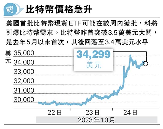 憧憬ETF快獲批 比特幣急升 3.4萬美元徘徊 較去年低位反彈逾1倍