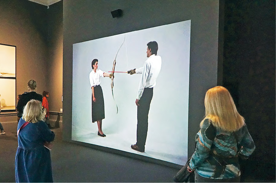 被視為行為藝術之母的Marina Abramović,作品大都挑戰自身精神和體能極限,如於展覽入口陳設的,是她在2010年MoMA展出的作品The Artist Is Present,展示她在館內與不同現場觀眾對望3個月的作品選段,以及一左一右展出她和觀眾的照片。她在1974年展出的成名作Rhythm 0,則是長達6小時,她本人企定定任由觀眾用枱上包括手槍、刀片等道具擺佈,探索公眾人士與空間的界限。
