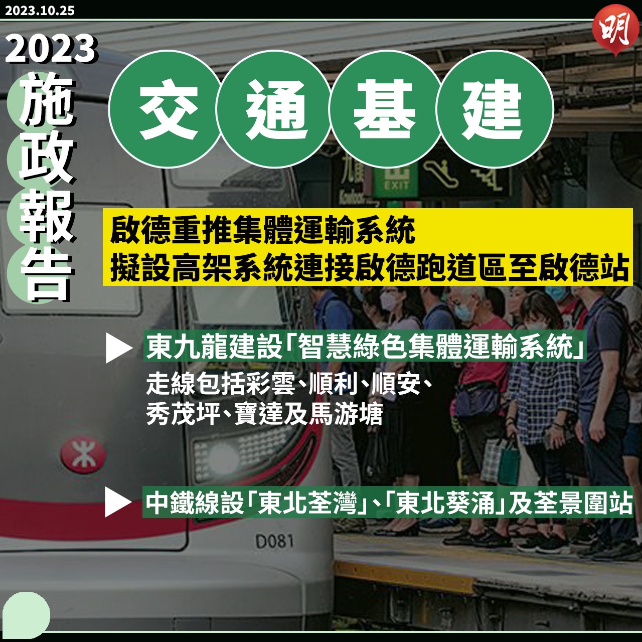 特首李家超於《施政報告》交代加強運輸網絡計劃,其中提出於東九龍、啟德及洪水橋/廈村建設「智慧綠色集體運輸系統」。另外中鐵線將有改良方案,設「東北荃灣」、「東北葵涌」及荃景圍站,並加推「兩鐵一路」新項目。