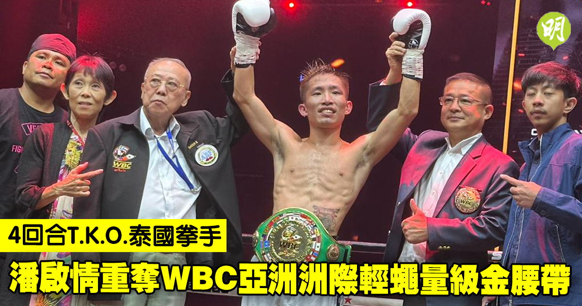 香港拳手潘啟情今(26日)在泰國舉行的「Way of the Champions:Fight to Survive」賽事,僅花4回合便將東道主選手Wichet Sengprakhon技術性擊倒(T.K.O.),相隔4年再奪WBC亞洲洲際輕蠅量級金腰帶,戰績改寫至9勝2負(6次K.O.)。27歲的潘啟情表示,這條金腰帶令自己在拳擊路上更堅定,「我好想繼續行落去,成為世界級拳手」。