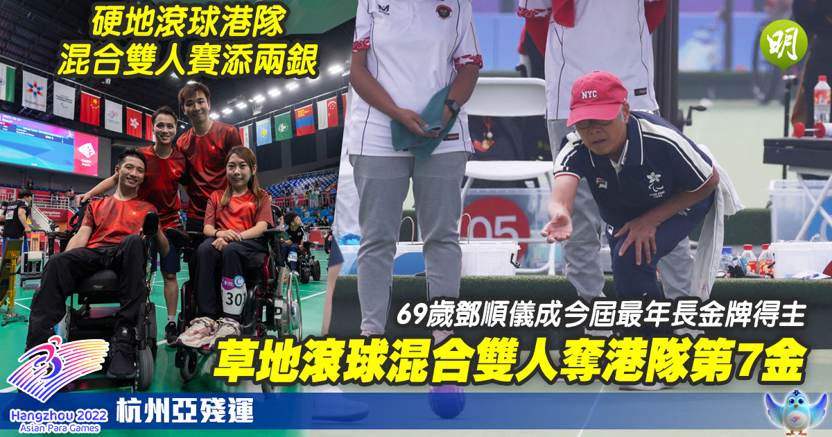 杭州亞殘運明日(28日)煞科,中國香港代表團今日(27日)再添金牌,其中草地滾球混合雙人B2項目,李志明/鄧順儀於決賽以15:8擊敗中國組合勇奪金牌,為港隊奪得今屆第7金,69歲的鄧順儀亦暫成今屆亞殘運最年長金牌得主;而硬地滾球港隊在梁育榮及何宛淇分途領軍下,於混合雙人賽增添兩銀。港隊暫以7金15銀22銅共44面獎牌,於獎牌榜排第10名。