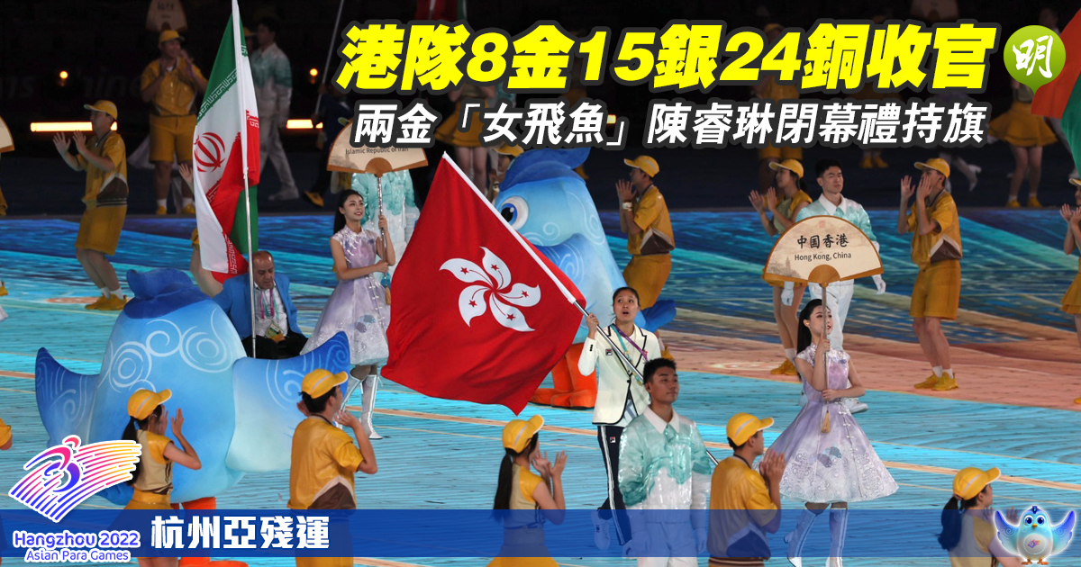 杭州亞殘運今日(28日)煞科,中國香港代表團憑殘疾乒乓球隊的王婷莛/吳玫薈WD22級女雙決賽擊敗日本隊,加上女子佩劍隊在團體賽的銅牌戰勝出,增添1金1銅,累積得8金15銀24銅、共47面獎牌,於獎牌榜排第10,至於個人包辦2金3銀的泳將陳睿琳則擔任閉幕禮的持旗手。