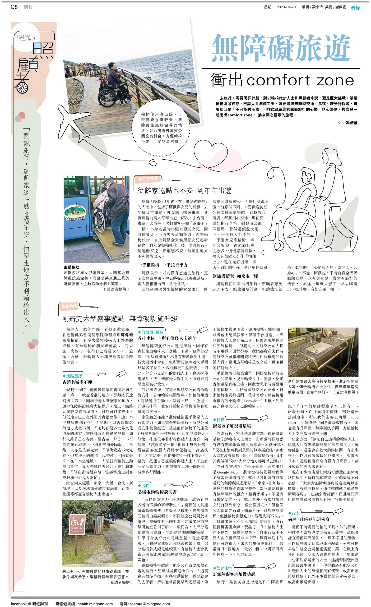 【明報專訊】去旅行,需要周詳計劃,對以輪椅代步人士和照顧者來說,更是巨大挑戰。單是輪椅運送寄存,已需大量準備工夫,還要籌謀無障礙交通、食宿、觀光行程等,每項都似是「不可能的任務」。阿歡為滿足女兒去旅行的心願,精心籌劃,與女兒一起衝出comfort zone, 換來開心愜意的旅程。