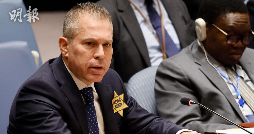 以色列與哈馬斯戰事持續,以色列駐聯合國大使埃爾丹(Gilad Erdan)周一(30日)出席安理會會議期間,與其代表團即場佩戴象徵猶太人遭納粹迫害的黃色大衛星標誌,標誌上寫有「永不重演」(Never Again)字眼。埃爾丹揚言將佩戴該標誌「直至安理會醒覺,譴責哈馬斯的暴行」,「直至納粹哈馬斯被消滅」。