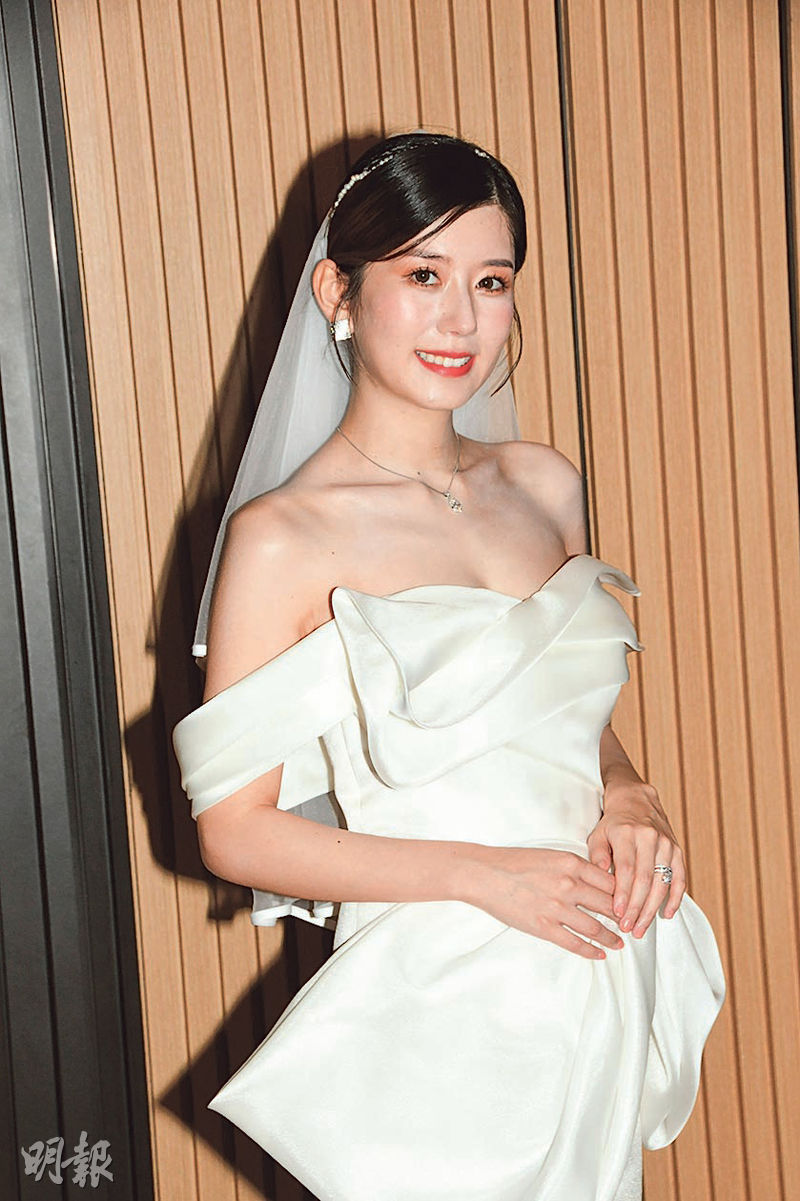 陳嘉慧由姊妹團陪伴接受傳媒訪問,新郎Calvin沒亮相。她稱婚禮好感動,大家也到場見證,平日丈夫說話不多,但想不到他準備得好好,有感動位,令她要忍淚水以免整花妝容。她給丈夫滿分,「佢所有嘢我都鍾意,很多謝他精心策劃這個婚禮」。丈夫是否有愛的承諾?陳嘉慧說:「一生一世聽太太話就無錯!」