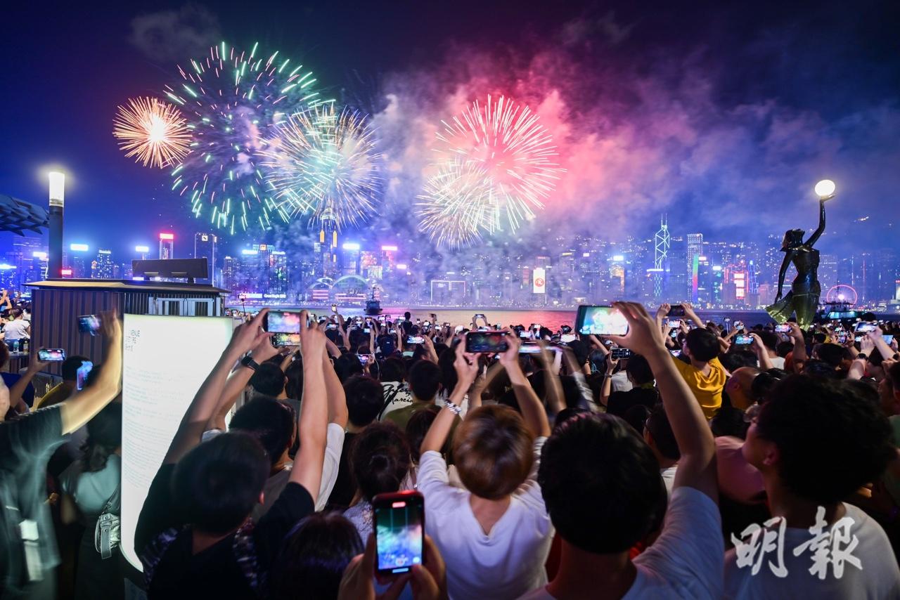 闊別5年的國慶煙花匯演9時開始,氣氛熱鬧。開始前4小時,在尖沙咀文化中心附近下午5時已人頭湧湧,不少人提早到場等待觀賞煙花,部分人席地而坐。現場有設置鐵馬分隔通道,亦有警員維持秩序,不時封鎖部分通道。根據記者現場觀察,現場大部份都是內地遊客,亦有港人一家大小到場。