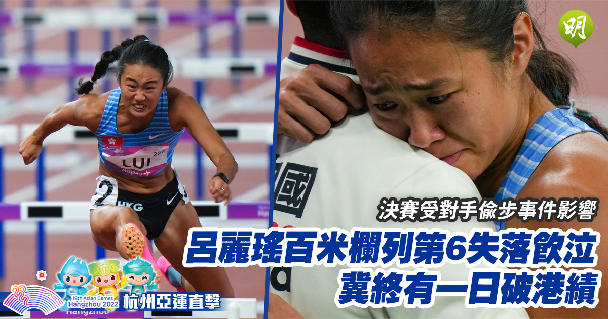 上屆雅加達亞運摘銅的呂麗瑤,昨於杭州亞運女子100米欄初賽超風速下跑出13.24秒,成功殺入今晚決賽。不過,中國隊的吳艷妮因偷步被取消資格,但擾攘一輪卻可重新上線,賽事重開後呂麗瑤以13.35秒衝線,僅排第6;重新上線的吳艷妮最終仍因偷步被取消資格,林雨薇則獲冠軍。呂麗瑤在賽後坦承受偷步事件影響,但只能相信裁判的決定,「對我來說是一個挑戰,我好想把握機會在亞運破香港紀錄。我只能專注比賽,不能因外界分心」。