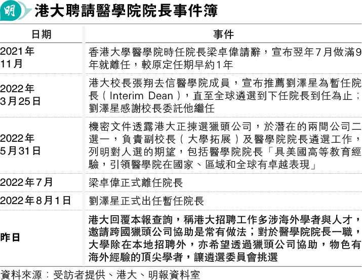【明報專訊】港大醫學院正遴選院長,劉澤星屬暫任,直至完成下任院長遴選。本報取得文件,透露港大去年中揀選獵頭公司,負責遴選醫學院長和副校長(大學拓展),文件列明要求,期望下任醫學院長具備「美國高等院校經驗」,帶領醫學院在國家、地區和全球有卓越表現。據悉校長張翔是醫學院長遴選委員會主席,劉澤星是最後兩名候選人之一,遴選工作踏入尾聲。