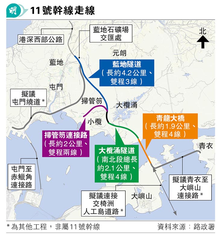 【明報專訊】連接元朗至北大嶼山的11號幹線動工有期,據環評報告,工程擬2026年首季動工,2033年第四季竣工,建成後將為現有青嶼幹線及屯門至赤鱲角連接路以外第三條通往大嶼山的行車通道。11號幹線規模龐大,其中包括全港首座南北行各4線、闊45米、長約1.9公里的跨海「青龍大橋」,以及全港首條雙管雙程4線、總長約2.1公里的「大欖涌隧道」。當局2026年起會先填海2.2公頃以建造大橋橋塔等,2028年首季建隧道及青龍大橋,最後於2031年建相關行政及通風大樓。
