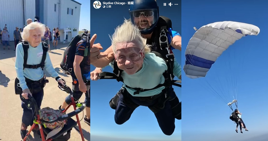 美國芝加哥104歲婆婆Dorothy Hoffner周日(1日)完成雙人跳傘,靠助行器步行的她有望成為健力士世界紀錄最老跳傘者,刷新在2022年被當時103歲的瑞典婆婆Rut Linnéa Ingegärd Larsson創下的紀錄。