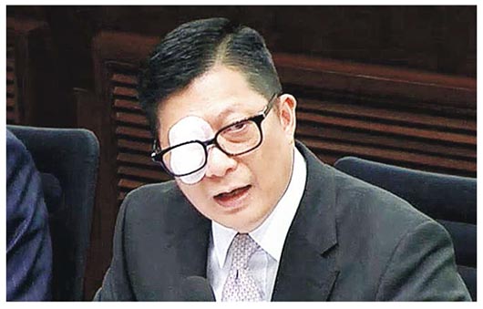 【明報專訊】保安局長鄧炳強噚日出席立法會會議時,右眼用紗布遮住,保安事務委員會代主席簡慧敏甫開首就問候佢,要代眾議員邀請佢解釋咩事。鄧炳強提到因為右眼感染發炎,所以要遮蓋右眼開會,並話「唔會影響表現,應該」,引來一眾議員笑聲。