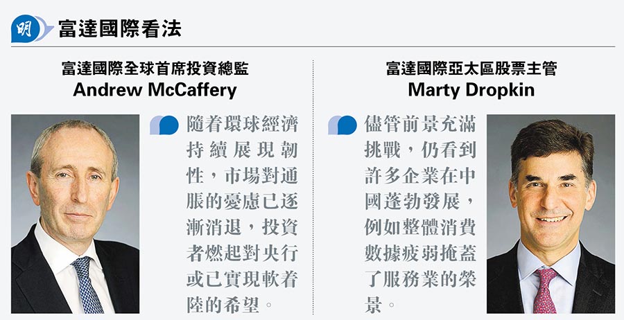 國際貨幣基金組織(IMF)預測,今年亞洲增長將佔全球成長的70%,富達仍相信中國將在推動這一地區增長中發揮核心作用。自2013年「縮減恐慌」(Taper Tantrum)以來,新興市場國家的財政狀况有所加強,經常帳餘額有所改善,以美元計價的債務減少,外匯存底增加。富達國際全球首席投資總監Andrew McCaffery表示:「隨着環球經濟持續展現韌性,市場對通脹的憂慮已逐漸消退,投資者燃起對央行或已實現軟着陸的希望。然而,富達認為經濟衰退風險仍偏高。」當緊縮貨幣政策的影響並未如預期般迅速傳導至實體經濟,例如許多企業正透過訂立多年的存款協議賺取利息,卻尚未開始支付疫情期間以超低利率累積債務應付的利息。富達認為緊縮貨幣政策的成效只是延遲而非失效,特別是當企業明年開始為其債務再融資時,情况或會急速逆轉。