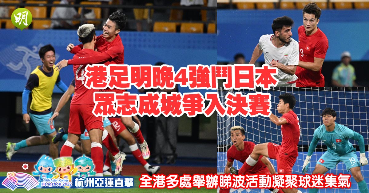 香港足球代表隊歷史性打入杭州亞運男足4強,明晚(4日)6時大戰日本隊爭入決賽。除了一眾港將眾志成城,為凝聚全港球迷集氣撐港足,多個地方都有舉辦睇波活動,期盼見證再創歷史。