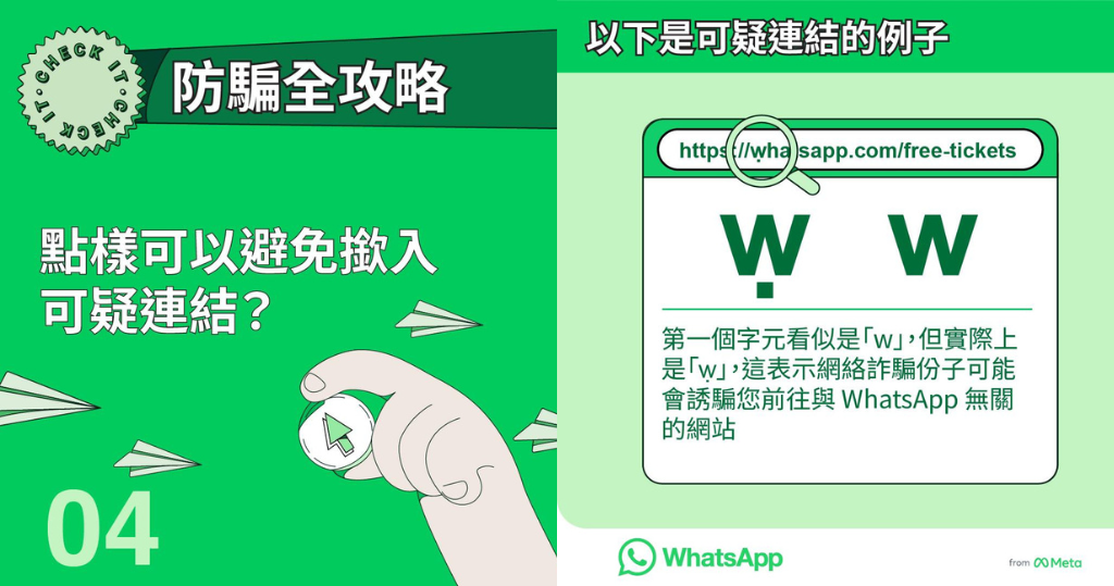 網絡上的假冒及詐騙連結防不勝防。Meta「We Think Digital Hong Kong」facebook專頁近日發帖,提醒大眾分辨可疑連結(例如連結有沒有亂碼或可疑字元)、勿隨意輸入個人資料等四個注意事項;而WhatsApp亦有自動識別功能提防可疑連結。