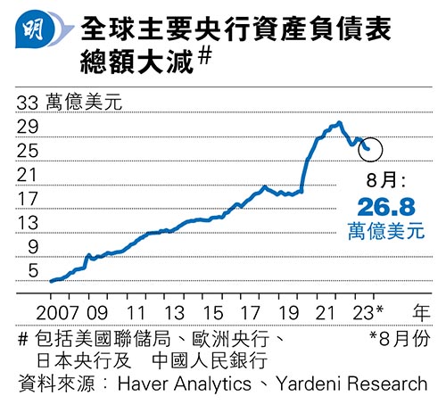 研究機構Yardeni Research綜合聯儲局、歐洲央行、日本央行及中國人行等4大央行的資產負債表,顯示已由2022年初高峰時約32萬億美元,縮減至今年8月份時不足27萬億美元(見圖),累計減少5萬億美元。適逢加息周期,全球經濟增長受壓下,致全球流入股市的資金量大減,港股市場難免受到影響。美息在過去不足一年半的加息周期中累計上調5.25厘,在高息環境下,亦影響到對冲基金入市的成本大升,為其提供槓桿融資的主要經紀借貸較前審慎。