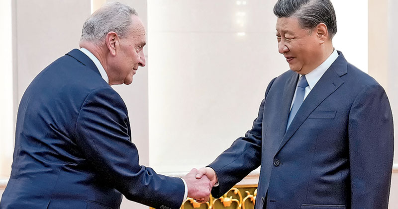 【明報專訊】國家主席習近平於昨日下午,在人民大會堂會見美國國會參議院多數黨領袖舒默率領的美國國會參議院兩黨代表團。這是時隔4年再有美國國會代表團訪華。習近平指出,中美關係是世界上最重要的雙邊關係。中美兩國如何相處,決定人類的前途和命運。競爭對抗不符合時代潮流,更解決不了本國自身的問題和世界面臨的挑戰。中方始終認為,中美共同利益遠遠大於分歧,中美各自取得成功對彼此是機遇而非挑戰。