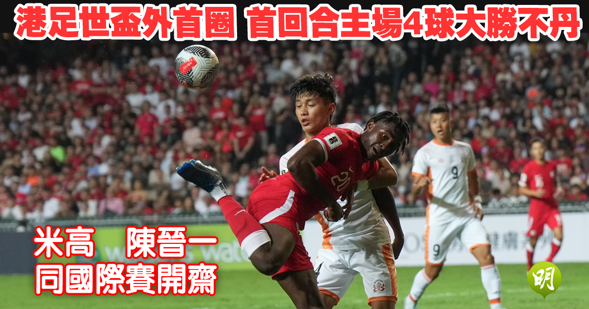 世界盃亞洲區外圍賽首圈今日(12日)展開,香港足球代表隊首回合在香港大球場迎戰不丹隊,在10259人入場下,憑非裔入籍前鋒米高梅開二度,與陳晉一同樣在國際賽「開齋」下,終大勝4:0,晉級形勢大好。港足明午起程離港,備戰下周二作客次回合。