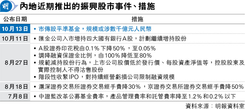 【明報專訊】外電引述消息稱,內地有關當局正考慮設立一隻由國家支持的平準基金,基金規模涉及數千億元人民幣,而早前有內地專家也呼籲設立平準基金,並建議先撥部分資金買入港股,再逐步把投資擴大到A股市場,可能成為繼匯金公司直接入市四大國有銀行及減證券印花稅後,進一步出招,以提振投資者對股市的信心。