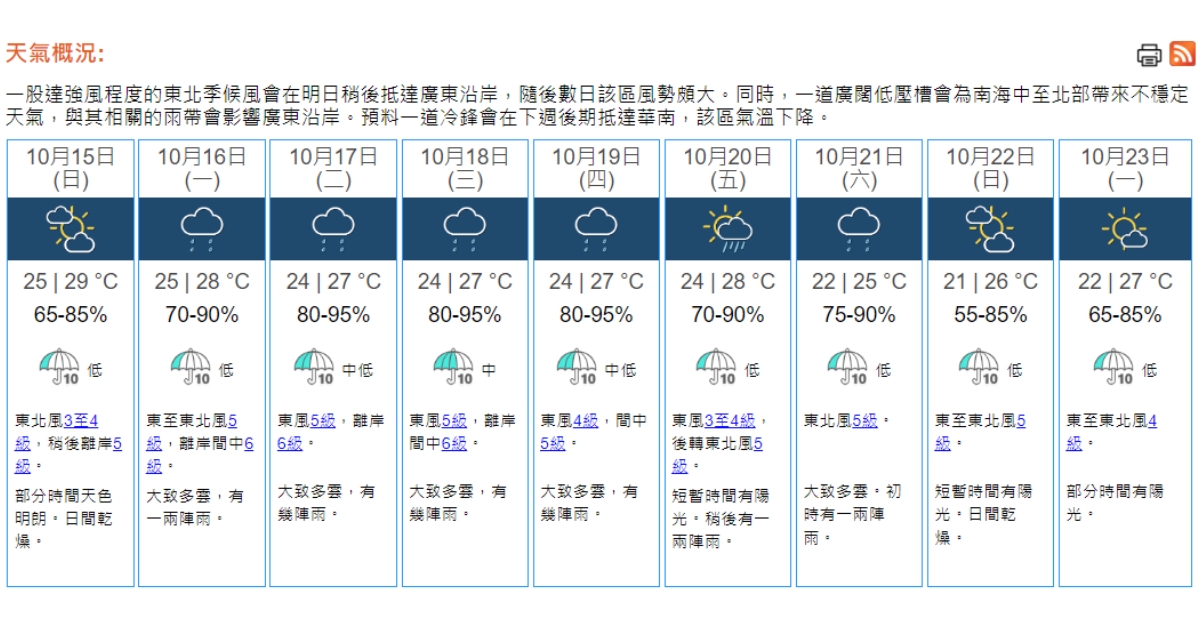 即時熱點 天氣|天文台:周日乾燥最高29°C 隨後數日風勢頗大 (20:00) 發佈於 2 年 前 2023 年 10 月 14 日 By 明報 【20:00】一股東北季候風正影響廣東。本港地區今晚(14日)及明日(15日)天氣預測大致多雲。明日部分時間天色明朗,日間乾燥。氣溫介乎25至29°C。吹和緩東北風,稍後離岸風勢清勁。展望隨後數日有幾陣雨,風勢頗大。 【10:12】早上10時,天文台錄得氣溫26.6°C,相對濕度61%。 一股東北季候風正為廣東帶來普遍晴朗及乾燥的天氣。本港地區今日(14日)天氣預測部分時間有陽光,最高氣溫30°C。日間乾燥。吹和緩東北風。展望明日(15日)短暫時間有陽光。隨後數日有幾陣雨,風勢頗大。(天文台) 相關文章:天文台天氣天氣速遞 Up Next 短片:海濱夜市開鑼半月 檔主稱人流減 市民:有新意才會再來 (17:18) 不要錯過 天氣|天文台:部分時間有陽光最高30°C 日間乾燥 (10:12) 繼續閱讀 贊助商 猜你喜歡 天氣|天文台:周日早上市區最低14℃ 部分地區寒冷 (17:55) 天氣|天文台:多雲有幾陣雨 今晚轉涼降至約17℃ (09:25) 【Emily】天文台「矚目天氣及氣候事件選舉」 投票有機會獲紀念品 天氣|天文台:周六多雲有雨 晚上轉涼氣溫17至21°C 下周日跌至最低14°C (21:22) 天氣|天文台:短暫時間有陽光 最高19°C (08:24) 天氣|天文台:周四多雲早晚有微雨 氣溫介乎17至20°C (20:57)