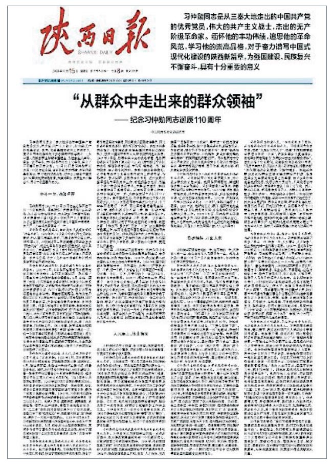 習仲勳1913年10月15日出生在陝西富平縣一個農民家庭,13歲在富平立誠中學加入中國共產主義青年團,15歲在國民黨監獄中轉為中國共產黨黨員;曾在陝甘(陝西、甘肅)發動「兩當兵變」,並參與創建陝甘邊革命根據地。日前,《陝西日報》頭版刊文介紹了習仲勳在陝甘寧邊區的主要事迹。文中寫到,「習仲勳同志波瀾壯闊的一生,是革命的一生,光輝戰鬥的一生,全心全意為人民服務的一生。他身上展現出來的中國共產黨人的崇高精神,永遠值得我們學習並發揚光大。」