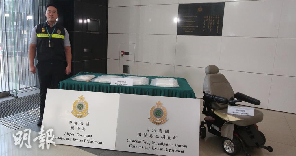 海關昨日(14日)於機場為經聖馬丁經法國巴黎抵港、男旅客清關,檢查其一中件寄艙的電動輪椅,發現X光影像可疑,作詳細檢查發現椅墊為重新縫合,關員其後在背墊及坐墊夾層共檢獲11公斤可卡因,市值約1200萬元。51歲男旅客涉嫌販毒被捕。