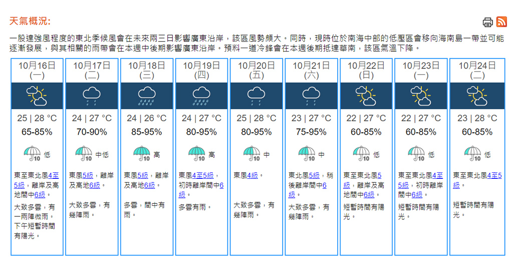 即時熱點 天氣|最高氣溫28°C 有一兩陣微雨 (08:49) 發佈於 2 年 前 2023 年 10 月 16 日 By 明報 早上8時30分,天文台錄得氣溫25.6°C,相對濕度74%。一股清勁至強風程度的東北季候風正影響廣東沿岸。同時,位於南海中部的低壓區正為該區帶來不穩定天氣。本港地區今日(16日)天氣預測:大致多雲,有一兩陣微雨。下午短暫時間有陽光,最高氣溫約28°C。吹和緩至清勁東至東北風,離岸及高地間中吹強風。展望未來兩三日風勢頗大,有幾陣雨。周三(18日)及周四(19日)雨勢較頻密。(天文台) 相關文章:天氣速遞編輯推介 Up Next 加沙醫院燃料僅能撐24小時 停屍間不足屍體暫放雪糕凍櫃車【短片】 (16:48) 不要錯過 打工仔肩頸背痛、「滑鼠手」 辦公室拉筋趕走痠痛【附動作示範圖】 (09:12) 繼續閱讀 贊助商 猜你喜歡 天氣|天文台:周日早上市區最低14℃ 部分地區寒冷 (17:55) 天氣|天文台:多雲有幾陣雨 今晚轉涼降至約17℃ (09:25) 天氣|天文台:周六多雲有雨 晚上轉涼氣溫17至21°C 下周日跌至最低14°C (21:22) 天氣|天文台:短暫時間有陽光 最高19°C (08:24) 天氣|天文台:周四多雲早晚有微雨 氣溫介乎17至20°C (20:57) 天氣|天文台:今早多區氣溫較昨日低1至2°C 日間最高21°C (08:24)