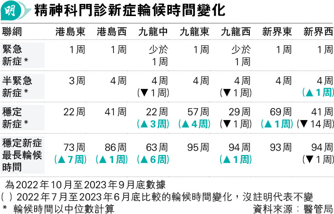 【明報專訊】醫管局公布最新精神科門診新症輪候時間,緊急及半緊急新症輪候時間中位數大致平穩,達到當局因荷里活廣場謀殺案額外訂立的目標、即分別不超過1周和不超過4周;惟部分聯網穩定新症輪候時間中位數較上次公布上升(見表),九龍東和九龍中聯網分別升4周及3周,至57周及22周,新界東聯網亦升1周至69周;4個聯網穩定新症最長輪候時間均上升,當中港島東聯網升至73周,升幅達7周。