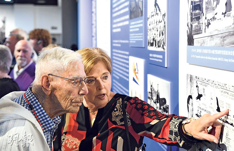 【明報專訊】美國飛虎隊老兵及後代訪華代表團近日抵華訪問北京,以及重慶、昆明、桂林等飛虎隊當年戰鬥過的地方,傳遞美中人民友誼。圖為飛虎隊老兵莫耶(前左)昨在重慶史迪威博物館參觀,端詳壁報資料。史迪威是二戰時盟軍中國戰區參謀長,其重慶舊居設為博物館。