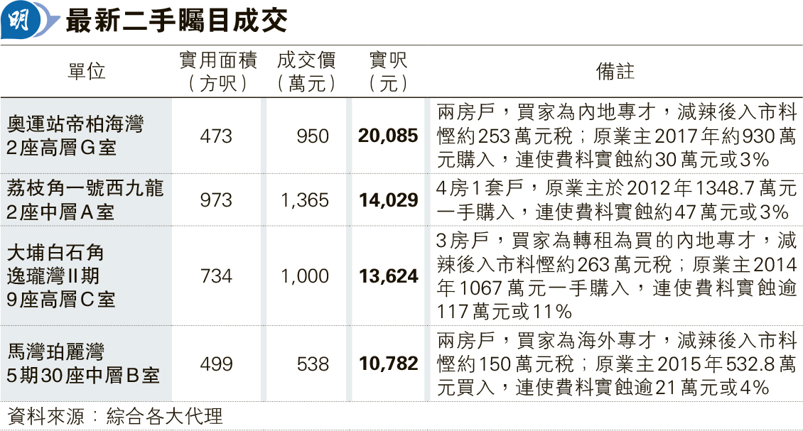 奧運站帝柏海灣亦新錄內地專才成交個案。美聯高級區域經理關穎賢表示,屋苑2座高層G室,實用473方呎,兩房間隔,因早前《施政報告》公布境外專才置業相關辣稅改為「先免後徵」,故近日吸引內地專才以950萬元承接單位,實呎20,085元。在新安排下,上述買家需繳交32萬元的稅項,估計節省約253萬元。單位原業主2017年8月斥資約930萬元購入上址,持貨6年,帳面獲利20萬元或約2%,但連使費計料實蝕約30萬元或3%。