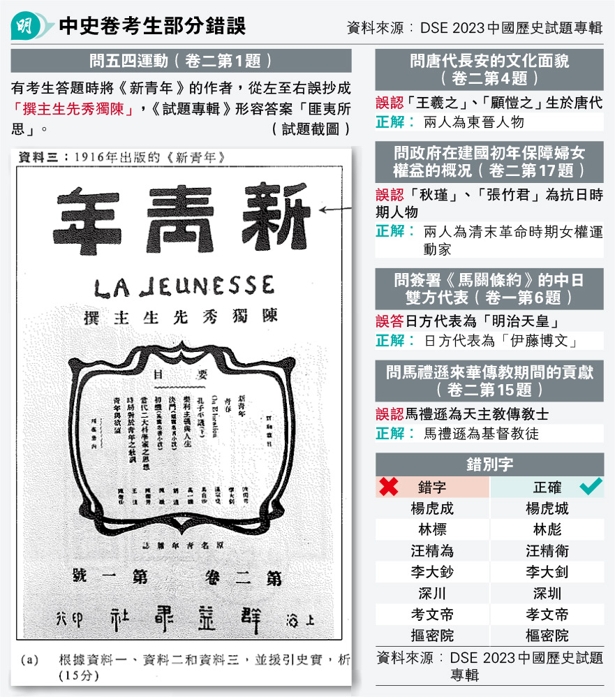 按中史科《試題專輯》,考評局稱考生整體表現與去年相若,但「一如既往,時見混淆史事、人物張冠李戴、朝代概念模糊、援引錯誤史料等」,並列舉部分錯處及常見錯別字(見表)。有考生作答涉五四新文化運動試題時,將資料圖片中《新青年》的作者誤抄成「撰主生先秀獨陳」,另有考生稱簽署《馬關條約》的日方代表為「明治天皇」,考評局形容兩項錯處「匪夷所思」及「令人啼笑皆非」。