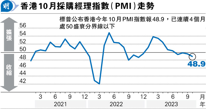 【明報專訊】標普全球公布,香港10月採購經理指數(PMI)按月跌0.7點至48.9,見近1年最低,並連續4個月低過50的盛衰分界線,反映私營經濟景氣轉差。