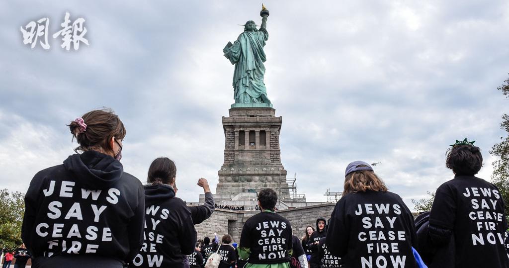 以色列與巴勒斯坦武裝組織哈馬斯戰爭爆發1個月之際,以軍反攻未見緩和,各地舉行活動呼籲停火及悼念死難者。猶太人組織Jewish Voice for Peace周一(6日)在美國紐約自由神像前靜坐抗議,要求在加沙地帶停火。約500名出席者穿上印有「猶太人說即時停火」(Jews Say Cease Fire Now)的衣服,舉起橫額並高喊「永不再發生在任何人身上」(Never again for anyone)。曼哈頓同晚有民眾悼念在戰事中喪生的記者。