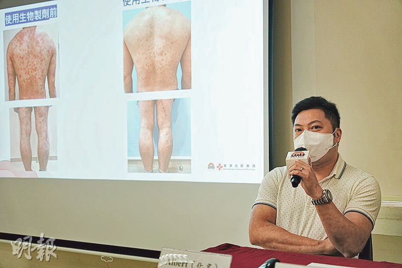【明報專訊】本港每千人有3人患有俗稱「牛皮癬」的銀屑病,患者身上會出現紅疹斑塊及銀色皮屑脫落等症狀。皮膚科專科醫生劉顏銘稱,該病可透過局部、光學或口服藥物治療,惟只能減少炎症細胞數量,未能阻斷特定調節性細胞因子,而透過部分生物製劑治療則可阻斷,雖仍不能斷尾,但可紓緩病情並維持長期療效。有患者透過聖雅各福群會惠澤社區藥房推出的生物製劑藥物資助計劃,注射白血球介素-23生物製劑,病情大有好轉,現只剩右小腿皮膚組織有斑塊,「終於有勇氣穿短衫短褲外出」。