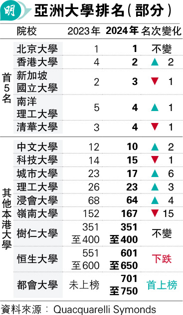 【明報專訊】國際高等教育資訊機構Quacquarelli Symonds(QS)公布2024年亞洲大學排名,北京大學蟬聯榜首,港大升兩位名列第二,新加坡國立大學排第三。本港10間上榜大學,一半排名上升。QS指本港大學的學術影響力突出,惟在研究成果產出落後,可透過着墨國際研究合作和招聘頂級學者彌補此輕微差距。QS又指國際化師資及學生表現有明顯下滑趨勢。