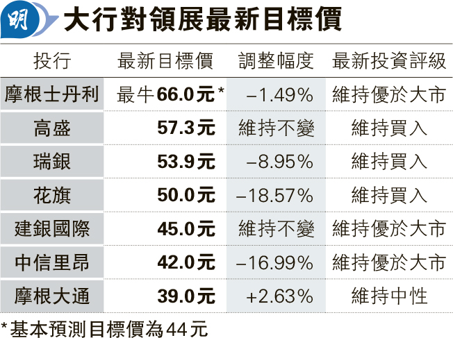 不過,不少大行都調低領展目標價,例如花旗由61.4元降至50元,瑞銀由59.2元降至53.9元,預期市場利率高企,削弱股份吸引力。匯豐則降至50元以下,主要由於租金和出租率預期,沒有之前那麼樂觀,將今後3個年度每基金單位分派預測,調低3.1%至5.5%。摩根大通認為,即使不加息,美國息口仍然高企,覺得本地電訊股或內地石油股,股息水平比領展更吸引,維持領展中性評級,建議等待更好的入市時機,例如明年若開始減息,領展將是本港地產股中最受惠股份。