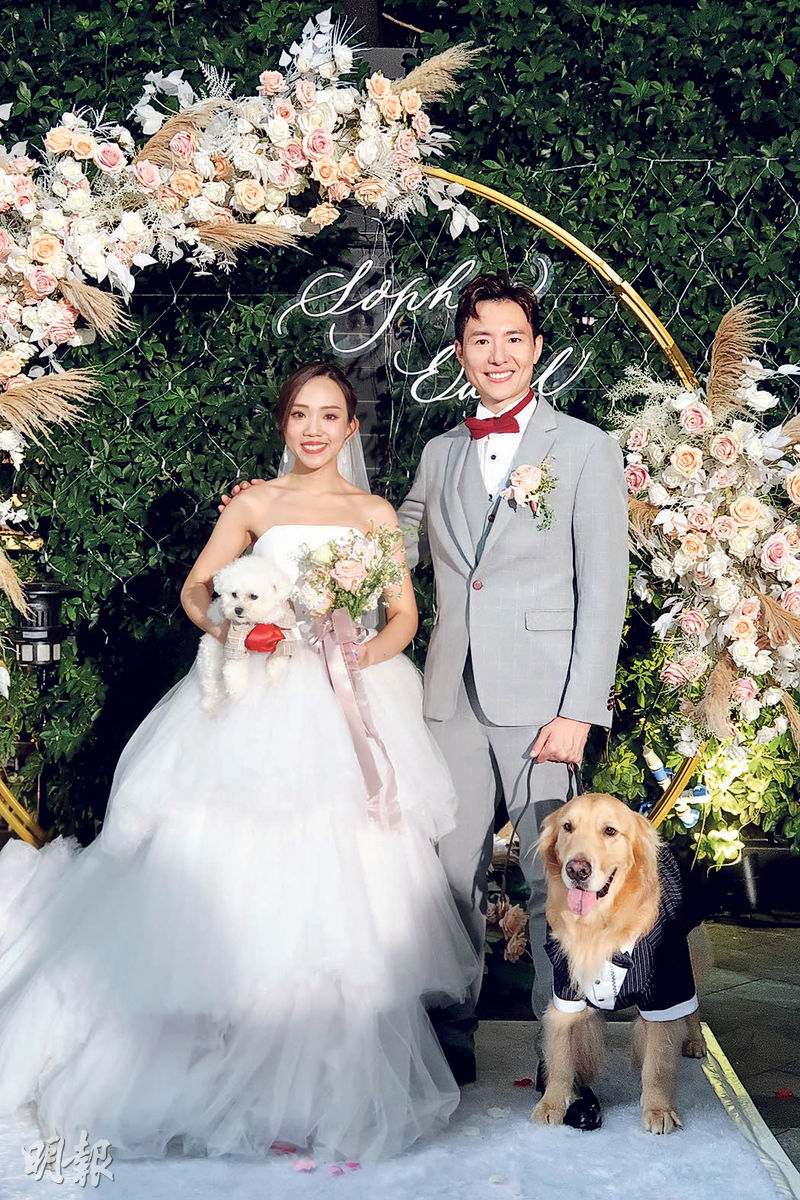 【明報專訊】無綫處境劇《愛.回家之開心速遞》中飾演「英進」的招浩明,昨日迎娶拍拖8年的圈外女友鄭紫筠(Sophia),於中環紅棉道的酒店舉行戶外婚禮及晚宴,一對新人宣讀誓辭時齊感動落淚,招浩明的愛犬Romeo拍過《寵愛Pet Pet》,在婚禮上負責運送戒指,兩人完成交換戒指儀式即情深一吻,獲全場歡呼祝福。跟新郎同是無綫藝訓班28期同學的周嘉洛、吳偉豪、關曜儁及梁証嘉擔任兄弟團,鄭丹瑞、林夏薇、湯盈盈、黃子恆、蔡國威、鄭世豪、阮政峰、葉蒨文及黃建東等到賀。