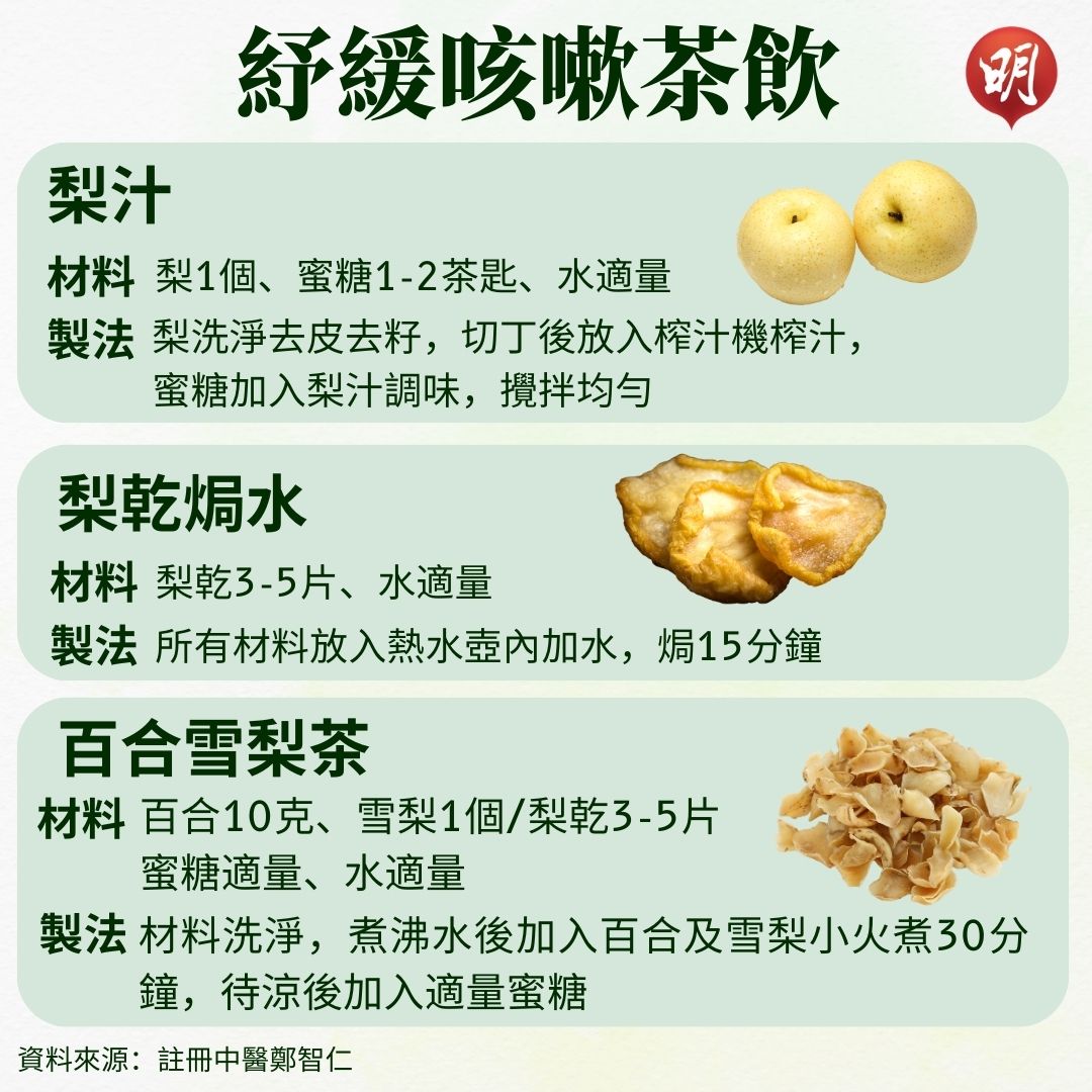 鄭智仁表示,感冒引致的咳嗽多為外感因素,肺失宣肅,肺氣上逆、衝擊氣道而致,宜選用潤肺止咳的食材如蜂蜜、梨等。蜂蜜味甘性平,能補中緩急、潤肺止咳,以及滑腸通便,注意嬰兒不宜吃;梨味甘微酸性涼,能潤肺清熱和生津,留意脾胃虛寒、腹瀉或腹脹的人慎食。