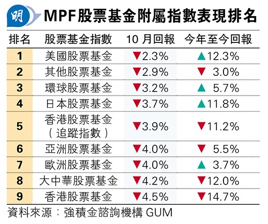 【明報專訊】全球主要股市於10月上旬反彈,但整個月計仍是跌市完場,延續了9月頹勢,進一步尋底。受累股債價格下滑,上月各類型強積金(MPF)近乎全錄得負回報,但市場相信加息周期近尾聲,11月份有望現轉機,從長線配置來說,估值持續於低位徘徊的中港股票基金或可重新考慮。