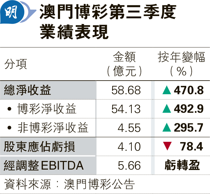 【明報專訊】澳門博彩(0880)公布9月底止第三季度及首3季業績。季內受惠於上葡京的除息稅、折舊及攤銷前虧損(LBITDA)大幅收窄,整體博彩淨收益隨着疫情後好轉,單季虧損按年大減78.36%至4.1億元。首3季虧損亦降至16.74億元,按年減少64.02%。
