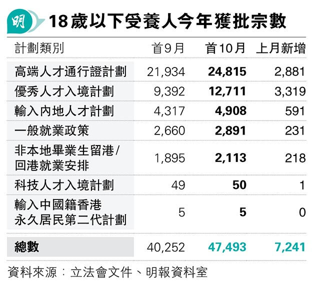 【明報專訊】各「人才輸入計劃」帶動其受養子女來港,可入讀本地中小學和幼稚園。政府最新數字顯示,單計上月有7241名18歲以下受養人獲批來港,其中最多循「優秀人才入境計劃」,有3319人(佔46%)。綜觀今年首10個月累計數字,47,493名相關受養人獲批來港。